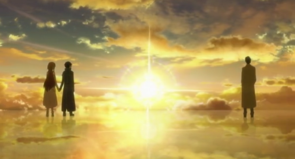 Luego de aquel diálogo, el mundo de Sword Art Online empezó a desaparecer poco a poco, debido a que Kayaba había programado la destrucción de SAO una vez se hubiera completado el juego, terminando en una luz centelleante y la silueta de Kirito y Asuna abrazados.